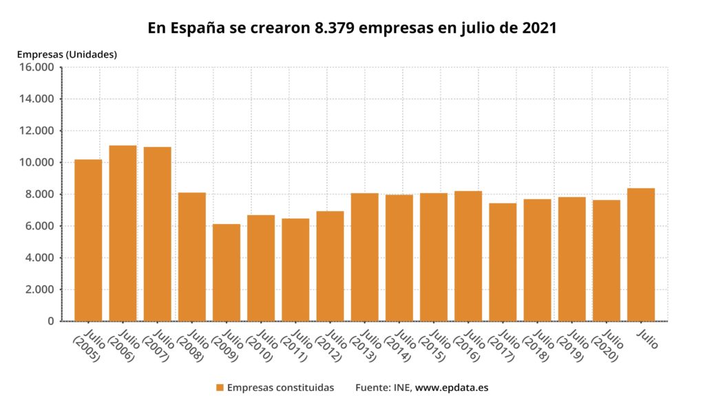 El número de nuevas sociedades mercantiles aumentó un 9,7% en julio en relación al mismo mes de 2020, hasta totalizar 8.379 nuevas empresas, la cifra más alta en un mes de julio desde 2007, según los datos difundidos este viernes por el Instituto Nacional de Estadística (INE), informa Europa Press.