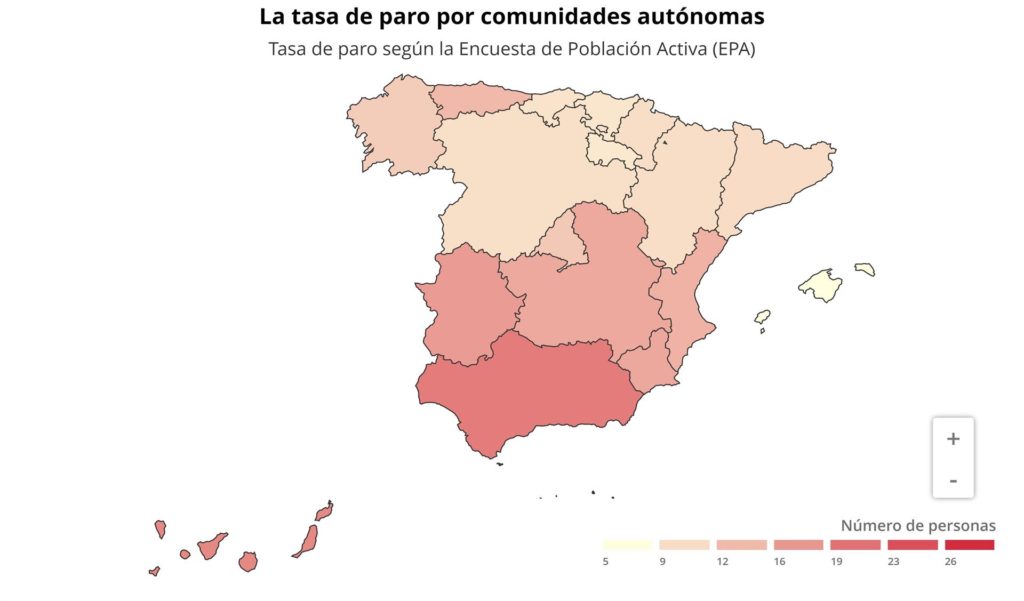 Según el INE, Baleares tiene la tasa de desempleo más baja de España, con un 5,79%, seguida de La Rioja (8,03%) y País Vasco (8,29%). Por el contrario, las tasas más elevadas se encuentran en Andalucía (18,98%), Canarias (17,73%) y Extremadura (15,85%).