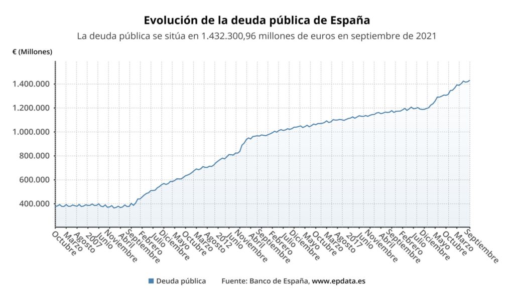 La deuda del conjunto de las administraciones públicas ha alcanzado en septiembre un nuevo máximo histórico tras registrar un incremento del 0,9% respecto al mes anterior, al sumar 12.885 millones de euros más, hasta alcanzar los 1.432.301 millones de euros, el 122,1% del PIB, según los datos publicados este miércoles por el Banco de España y difundidos por Europa Press.