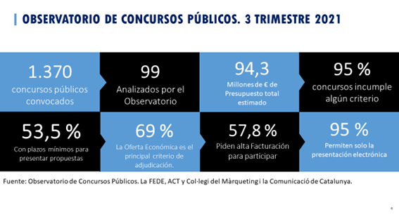 De todos los concursos analizados en el tercer trimestre de 2021, el 95% impone la vía electrónica como única posibilidad de presentación; el 69% valora el precio por encima de las propuestas técnicas; el 58% exige a las empresas una alta facturación; y el 54% tiene un plazo de presentación de propuestas inferior a tres semanas, claramente insuficiente para poder realizar una campaña o planificar las acciones de publicidad requeridas.