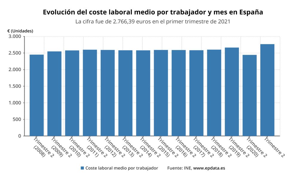 El coste laboral se compone del coste salarial y de los otros costes. Entre abril y junio, los salarios (que comprende todas las remuneraciones, tanto en metálico como en especie) subieron un 14,4 % interanual, su mayor alza de la serie histórica, hasta situarse en 2.064,37 euros por trabajador y mes, cifra que supera el nivel prepandemia (1.992,18 euros en el segundo trimestre de 2019).