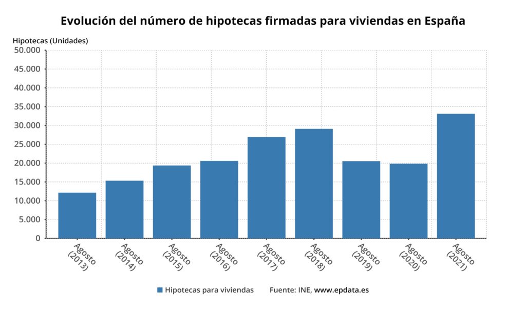El número de hipotecas constituidas sobre viviendas se disparó un 66,9% en agosto respecto al mismo mes de 2020, su mayor alza desde el inicio de la serie, en 2003, hasta sumar un total de 33.105 préstamos, según los datos difundidos este miércoles por el Instituto Nacional de Estadística (INE) y publicados por Europa Press.