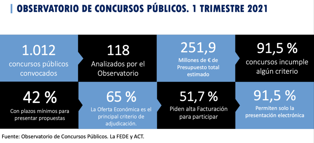El 91% de los concursos de creatividad y gestión de medios convocados por las administraciones públicas durante el primer trimestre de 2021 presenta algún tipo de irregularidad. Es la principal conclusión del primer estudio realizado por el Observatorio de Concursos Públicos de Publicidad, impulsado por la Asociación de Agencias de Creatividad Transformadora (ACT) y la Federación de Empresas de Publicidad y Comunicación (La FEDE), tras analizar 118 licitaciones públicas valoradas en 250 millones de euros y presentadas en los tres primeros meses de este año.