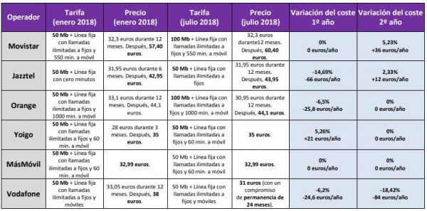 Quienes quieran línea de teléfono en casa, encontrarán la mejor oferta en Orange, que además ofrece 100 Mb de velocidad. Desde el 19 de julio, la compañía rebaja a 30,95 euros su tarifa durante el primer año, pero el precio sube después a 44,1 euros. Para los hogares en los que no se pueda instalar fibra óptica, Orange ofrece 20 Mb de ADSL como alternativa. Vodafone, que es el operador que más ha rebajado sus tarifas en 2018 (-18,42%), y su tarifa de 50 Mb de fibra óptica o de 30 Mb de ADSL para los que no tengan cobertura, tiene un coste de 31 euros sin subidas (¿las dos 31 euros? ¿sin subidas posteriores?). El problema es que exige 24 meses de permanencia frente a los 12 meses de Orange.