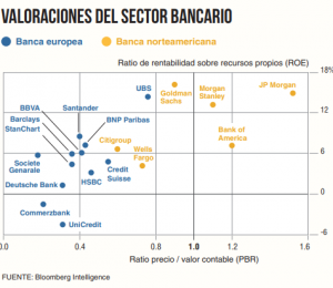 La pandemia mundial ha aumentado sus vulnerabilidades, llevando los precios de las acciones de bancos europeos a mínimos históricos. Y la brecha entre los bancos de la UE y sus rivales estadounidenses, como JPMorgan y Morgan Stanley, no ha hecho más que crecer desde 2008, como muestra el gráfico de Bloomberg que une el valor en libros de las entidades con la tasa de retorno sobre su capital. Las fusiones en España y en Italia no son más que el preludio de las fusiones trasnacionales, y los consejos de administración de los bancos no hablan de otra cosa: crear gigantes europeos que les permitan sobrevivir tras la era post-Covid.