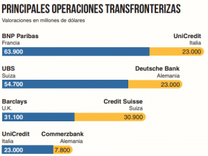 Cuatro operaciones trasnacionales son ahora la ‘comidilla’ del mundo bancario europeo: La absorción del francés BNP con el italiano Unicredit; la de Deutsche Bank por parte del gigante suizo UBS; la fusión en igualdad de condiciones del británico Barclays y los suizos Credit Suisse, con los problemas de fondo que causa el recién estrenado Brexit, y la absorción del germano Commerzbank por parte de UniCredit, que pasaría de “pez pequeño” a “pez grande” y a comer en lugar de ser comido por el BNP francés.