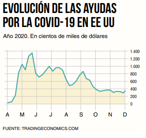 Aún es peor pensar que se va a conseguir recuperar el empleo y reducir el déficit cerrando la economía. En el gráfico a continuación podemos ver como a medida que bajo la Administración de Donald Trump se reabrieron estados, los subsidios de ayuda por la Covid-19 se redujeron drásticamente.