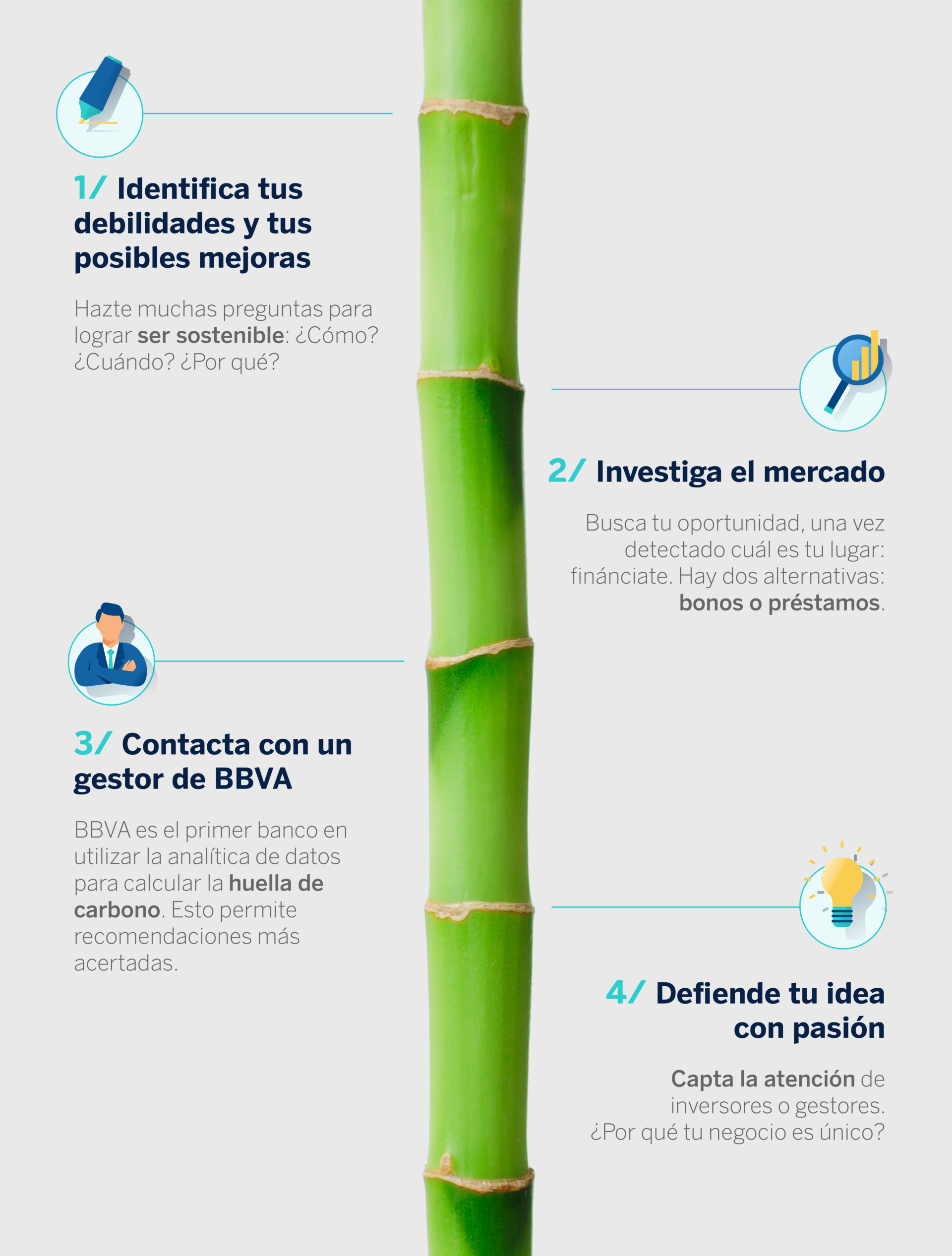 Para conseguir financiación y captar la atención de inversores o gestores, suele ser recomendable transmitir la pasión que sientes por tu proyecto. También en este caso es aconsejable que le cuentes al gestor de BBVA con el mismo entusiasmo en qué consiste el negocio y cómo podéis avanzar juntos en tu transición ecológica. La presentación tiene que ser creíble y atractiva. Además de presentar un proyecto con un plan de negocio sólido, se trata de mostrar por qué ese proyecto es necesario y qué aporta a la sociedad o qué problema soluciona, especialmente si hablamos de emprendimientos. Del mismo modo, es conveniente resaltar quiénes son los miembros del equipo y qué aporta la formación de cada uno de ellos al proyecto.